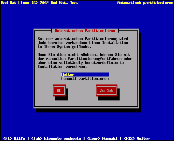 Bei einer Server-Installation mit automatischem Partitionieren werden alle Daten auf allen Festplatten- Speichern gelöscht. Wenn Sie diese Daten behalten möchten, lesen Sie den Anhang C.