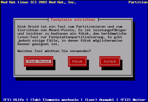 Wenn Sie manuell partitionieren möchten, können Sie zwischen zwei Partitionstools Disk Druid oder fdisk wählen (siehe Abbildung 3-7).
