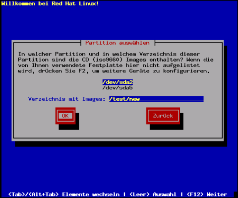 Geben Sie den Gerätenamen der Partition ein, in der sich die Red Hat ISO-Images befinden. Es gibt auch ein Verzeichnis mit der Bezeichnung Verzeichnis mit Images. Wenn sich die Red Hat ISO-Images nicht im Root-Verzeichnis dieser Partition befinden, geben Sie den Pfad zum Verzeichnis der ISO-Images ein (wenn die ISO-Images beispielsweise unter /test/new/RedHat installiert sind, geben Sie /test/new ein).