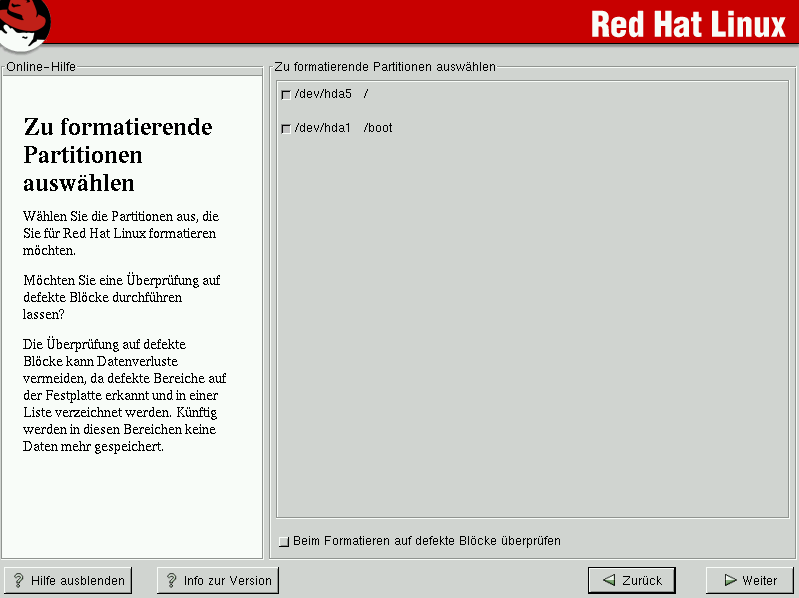 | Zurück | Kapitel 4 Installation von Red Hat Linux | Vor |