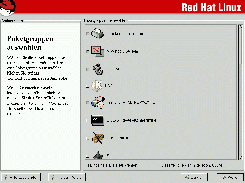 Einige Pakete (wie zum Beispiel der Kernel und bestimmte Bibliotheken) sind für jedes Red Hat Linux System erforderlich und können nicht selektiert oder deselektiert werden. Diese Pakete sind bereits standardmäßig ausgewählt.