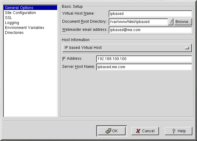 The Site Configuration, Environment Variables, and Directories options for the virtual hosts are the same directives that you set when you clicked the Edit Default Settings button, except the options set here are for the individual virtual hosts that you are configuring. Refer to the section called Default Settings for details on these options.