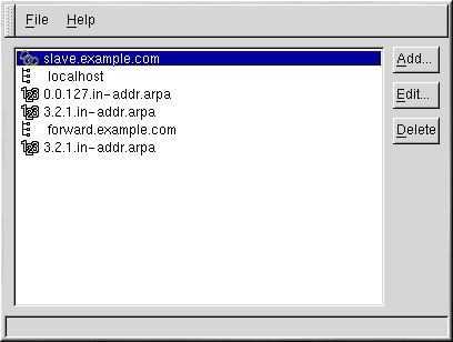 BIND Configuration Tool allows you to add a forward master zone, a reverse master zone, and a slave zone. After adding the zones, you can edit or delete them from the main window as shown in Figure 12-1.