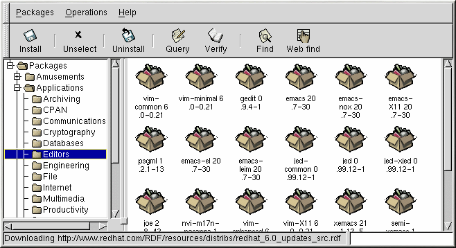 Si no quiere utilizar la versión de línea de comandos de RPM, puede usar la Gnome-RPM, una herramienta gráfica que se ejecuta con el sistema X Window. El autor de dicha herramienta es James Henstridge (<james@daa.com.au>); Red Hat ofrece el soporte para el RPM 3.0 y Daniel Veillard escribió el código adicional rpmfind.