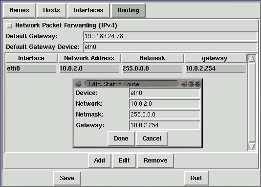 En la pantalla de gestión Routing puede añadir, modificar o suprimir las rutas de red estáticas. Añadir o modificar una entrada implica acciones idéticas, como el panel Hosts. Aparecerá una ventana de diálogo de modificación; escriba tan sólo la información nueva y pulse Done cuando finalice. Vea como ejemplo el Figura 15-5.