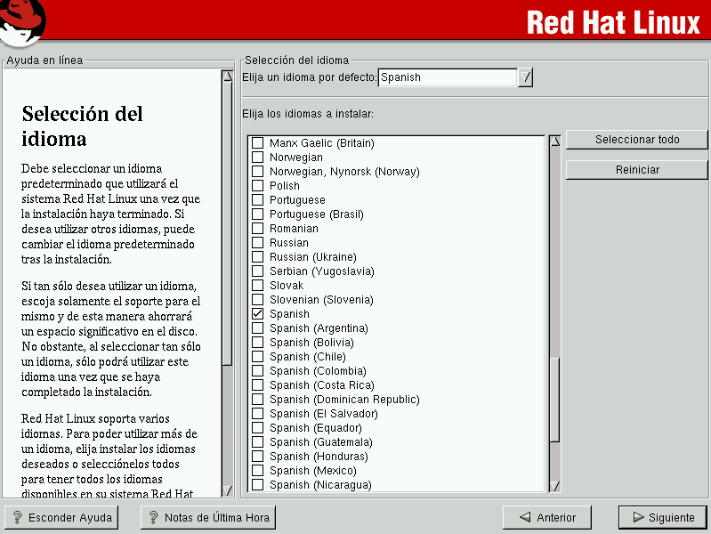 Debe instalar un idioma para usarlo como idioma por defecto. El idioma por defecto será usado por Red Hat Linux una vez que la instalación se haya completado. Si elije instalar otro idioma, podrá cambiar su idioma por defecto más adelante.