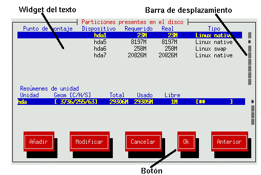 Figura 5-4. Widgets del programa de instalación tal y como aparecen en Disk Druid