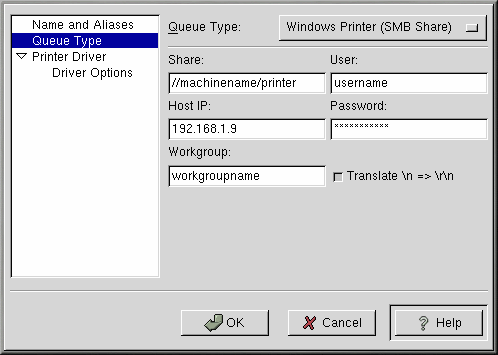 Share — Der Name des gemeinsam genutzten Druckers, auf dem Sie drucken möchten. Es muss der selbe Name sein, der auf dem Remote-Windows-Computer als Samba-Drucker festgelegt ist. Beachten Sie die Syntax von //machinename/sharename.