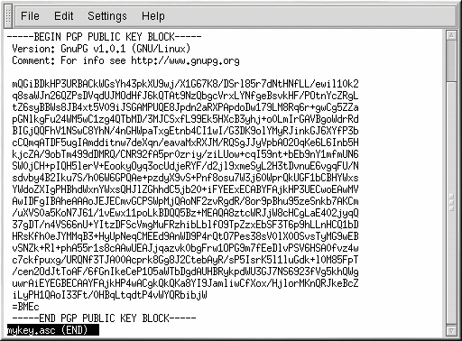 Öffnen Sie Ihre exportierte Schlüsseldatei (wie meinschlüssel.asc, die in Abschnitt namens Exportieren auf einen Schlüsselserver erstellt wurde) mit einem Pager, —& beispielsweise durch Eingabe von less meinschlüssel.asc.
