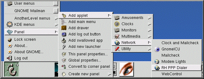 Sobald Sie Ihren PPP-Account konfiguriert haben, starten Sie RP3 durch Klicken mit der rechten Maustaste auf das Panel und Wählen der Menüeinträge Applets => Network => RH PPP Dialer.