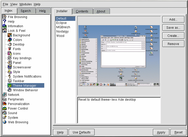 Klicken Sie für das Auswählen eines neuen Themes zuerst auf die Kategorie Theme Manager (siehe Abbildung 4-4). Standardmäß stehen Ihnen verschiedene Themes zur Verfügung. Sie können aber unter http://kde.themes.org jederzeit weitere Themes herunterladen.