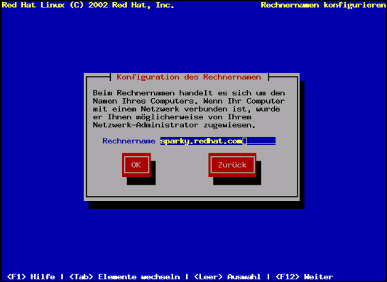 In diesem Beispiel ist hostname der Name, den Sie für Ihren Computer gewählt haben und domain.name ist die TCP/IP Domäne. (Ein Domänenname kann mehrere Nodes enthalten, Zum Beispiel: eastcoast.mainserver.redhat.com und westcoast.mainserver.redhat.com.)
