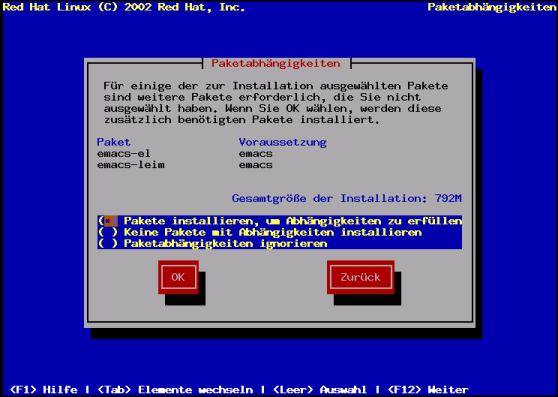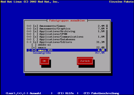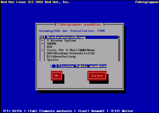 Einige Pakete (wie zum Beispiel der Kernel und bestimmte Bibliotheken) sind für jedes Red Hat Linux System erforderlich und können nicht selektiert oder deselektiert werden. Diese Pakete sind bereits standardmäßig ausgewählt. |