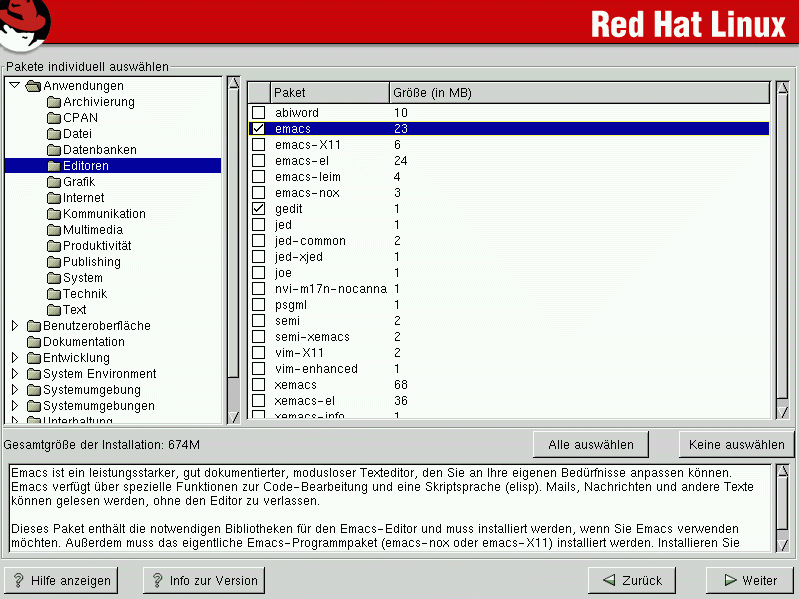 Einige Pakete (wie zum Beispiel der Kernel und bestimmte Bibliotheken) sind für jedes Red Hat Linux System erforderlich und können nicht selektiert oder deselektiert werden. Diese Pakete sind bereits standardmäßig ausgewählt. |