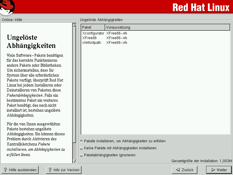 Der Bildschirm Ungelöste Abhängigkeiten wird nur dann angezeigt, wenn bestimmte Pakete fehlen, die für die von Ihnen ausgewählten Pakete benötigt werden. Im unteren Teil des Bildschirms und unterhalb der Liste mit den fehlenden Paketen befindet sich das Kontrollkästchen Pakete installieren, um Abhängigkeiten zu erfüllen, das standardmäßig aktiviert ist. Wenn Sie dieses Kontrollkästchen aktiviert lassen, löst das Installationsprogramm automatisch alle Paketabhängigkeiten, indem es alle benötigten Pakete in die Liste der ausgewählten Pakete einfügt.