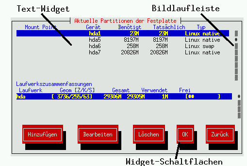 Das Installationsprogramm für Red Hat Linux im Textmodus verfügt über eine bildschirmorientierte Oberfläche mit Widgets, die Sie zum größten Teil bereits von anderen grafischen Benutzeroberflächen kennen. Abbildung 3-1 und Abbildung 3-2 zeigen die dargestellten Bildschirme. Bitte beachten Sie, dass die in diesem Dokument Screenshots der x86 Installation entnommen sind und für die Text-basierte Installation für zSeries maßgeblich sind.