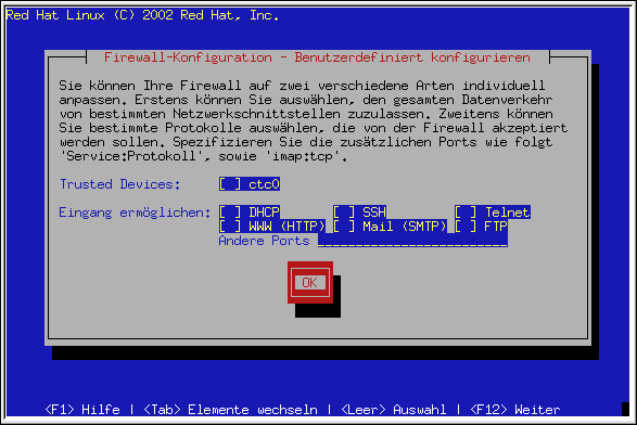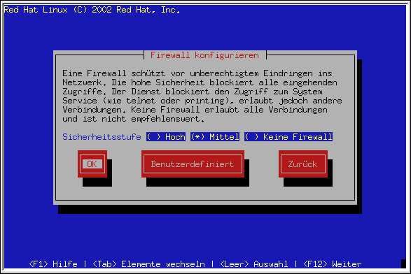 Red Hat Linux bietet einen Firewall-Schutz als weitere Sicherheit für Ihr System. Die Firewall befindet sich zwischen Ihrem Computer und dem Netzwerk und bestimmt, auf welche Ressourcen Ihres Computers Remote-Benutzer des Netzwerks zugreifen können. Eine korrekt konfigurierte Firewall kann die Sicherheit Ihres Systems erheblich verbessern.
