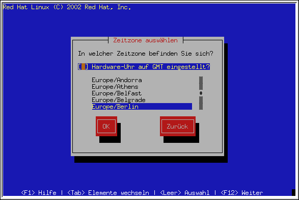Wenn Sie die Konfiguration Ihrer Zeitzone ändern möchten, nachdem Sie Red Hat Linux gebootet haben, melden Sie sich als Root an, und verwenden Sie den Befehl /usr/sbin/timeconfig. |
