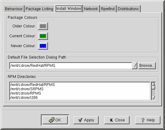In Install Window,, you can specify the path where Gnome-RPM can find new RPMs on your system. Refer to Figure 18-5 for an example of this dialog. If you're using your Red Hat Linux CD-ROM, this path will probably be