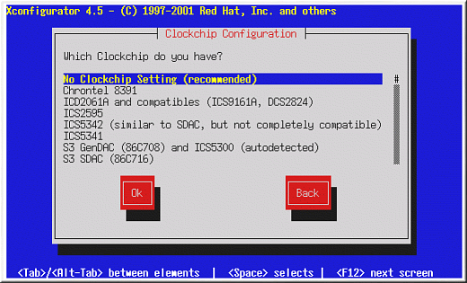 Next, choose a clockchip setting if your video card supports it (if it has one). The recommended choice is No Clockchip Setting, since XFree86 can automatically detect the proper clockchip in most cases.