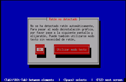 Puede escoger continuar con una instalación GUI o bien en modo texto , en la que no es necesario el uso del ratón. Si escoge continuar con una instalación gráfica (GUI), necesitará ver el programa de instalación con la información de la configuración del ratón (remítase al Figura 4-3).