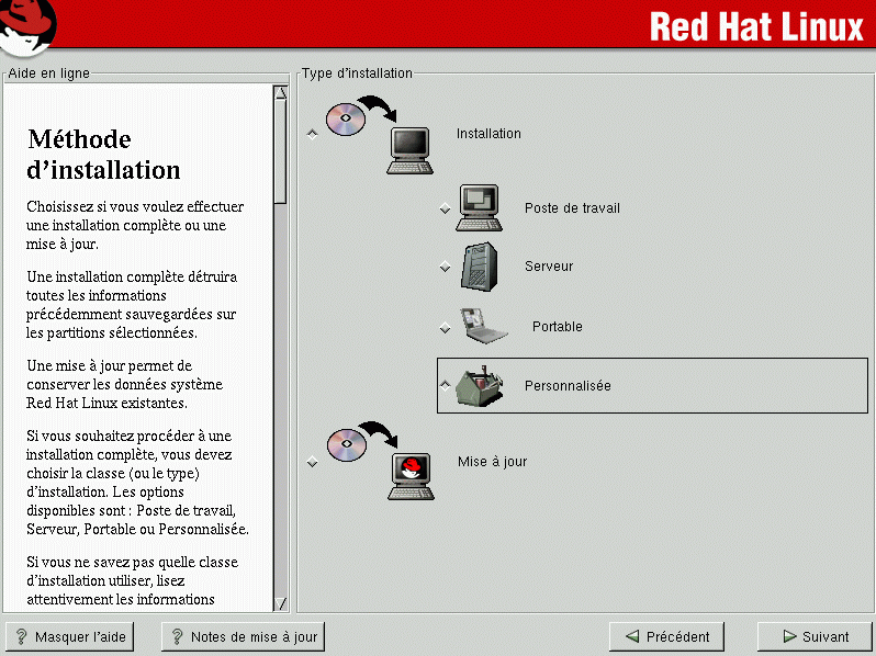 Red Hat Linux vous permet de sélectionner le type d'installation qui répond le mieux à vos besoins. Les installations disponibles sont : Poste de travail, Serveur, Portable, Personnalisée ou Mise à jour.