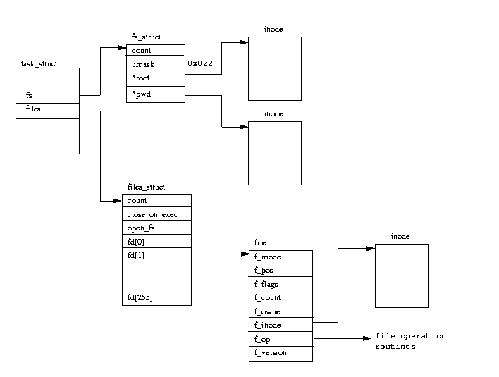 ひとつめの、 fs_struct は 当該プロセスの VFS inode とその umask に対するポインタを含んでいる。 umask とは新しいファイルが作成される際のデフォルトモードであり、 そのモードはシステムコールを介して変更可能である。