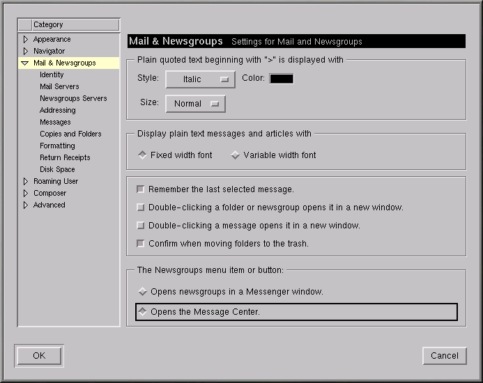 The remainder of the categories in this section allow you to modify or accept settings for such options as message formatting, addressing, and disk space use.
