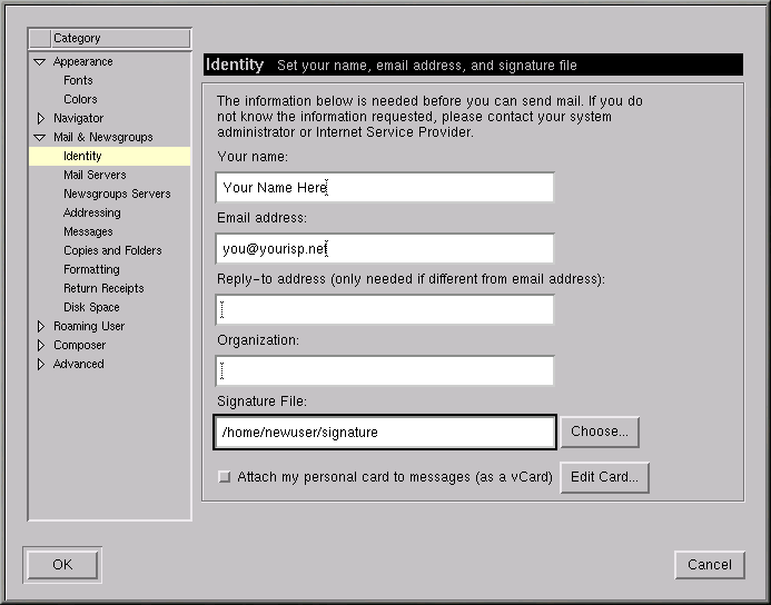 You can specify where you want your mail to be stored by either typing in the location in Local mail directory, or by clicking on the Choose button, and selecting a directory in the navigation window which opens. By default, mail will be stored in a directory in your user directory; if your name is newuser, for example, the path to the directory will be /home/newuser/nsmail.