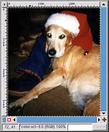 ボニーの写真より大きな新しい画像を、白い背景で作成します。大きな白い画像に、ボニーの画像をカット&ペーストします。四角い選択ツールを使って、ボニーの画像よりわずかに小さな四角い領域を選択します。画像を右クリックし、選択=>反転と選択して選択部分を反転させます。これで、画像の周りの四角い「枠」がFigure 9-13のように選択されます。