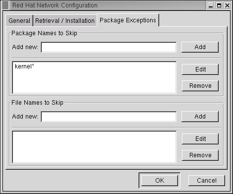 [Package Exceptions]タブ(Figure 12-4を参照)では、特定のファイルやパッケージに関する通知を行わないようにRed Hat Update Agentに指定することができます。省略するファイルやパッケージのリストを管理するには、[Add]、[Edit]、[Remove]の各ボタンを利用します。