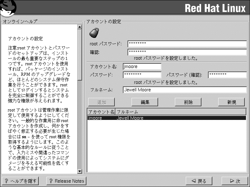 rootアカウントと rootパスワードの設定は、インストール時の最も重要なステップの 1つです。rootアカウントはWindows NTマシンで設定する管理者アカウントに似ています。 rootアカウントは、パッケージのインストール、RPMのアップグレード、ほとんどのシステムの 保守の為に使います。rootでログインするとシステムに対して全面的な制御をする権限を持つ ことになります。