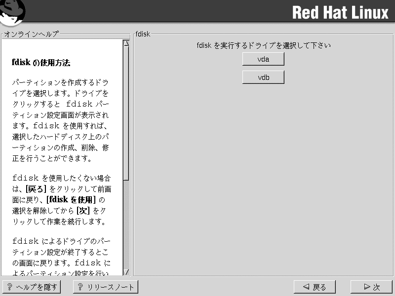 以前にfdiskを 使用した経験があり、さらにその動作を理解している場合以外、fdiskを お勧めできません。 Disk Druidは fdiskよりも 簡単に理解できます。fdiskを終了するには、戻る ボタンを押して、元の画面に戻ります。そこで fdiskの選択を解除して 次のボタンを押します。 |
