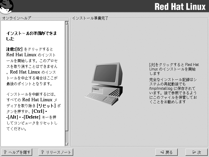 ここで、Red Hat Linuxのインストールの準備が出来たことを示す画面が表示されます。
