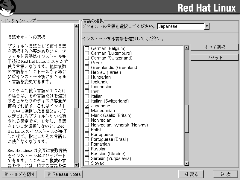 システムで複数の言語を使用する場合は、インストールする言語を個別に選択するか、 すべての言語を選択して利用可能なすべての言語をRed Hat Linuxシステムにインストールします。