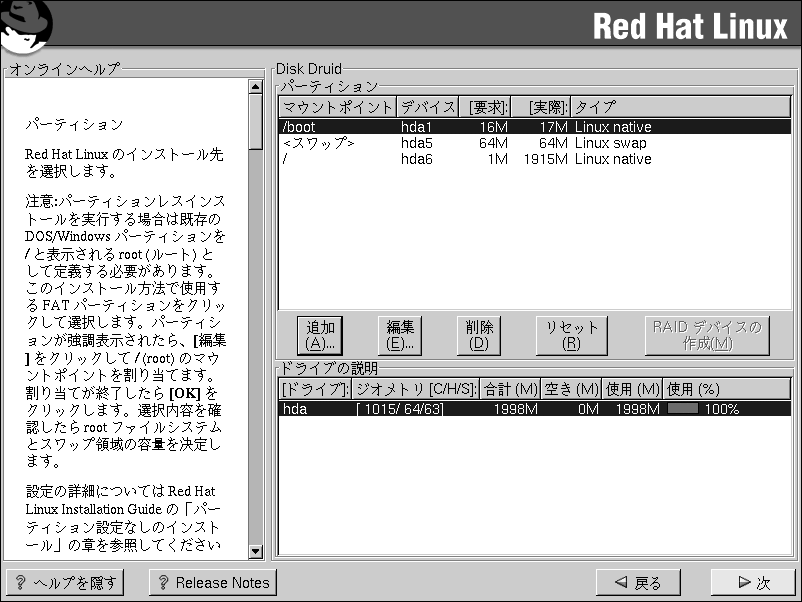 Red Hat Linux 7.1で使用されるパーティション設定ツールはDisk Druidです。 難解な状況を除いては、Disk Druidで 標準的な Red Hat Linuxインストールの パーティション設定を処理することが出来ます。