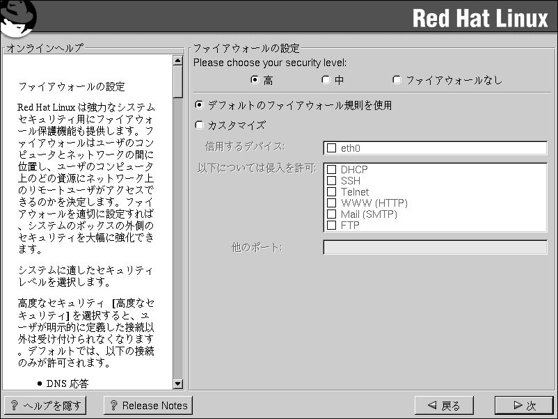 「ファイヤーウォールなし」を選択すると、システムに完全なアクセスを許すことになり、 セキュリティチェックがありません。セキュリティチェックは一定のサービスに対するアクセスを 無効化します。これは、信頼できるネットワーク(インターネットではない)上で稼働しているか 又は、 後でファイアウォール設定を計画している時のみに選択すべきです。