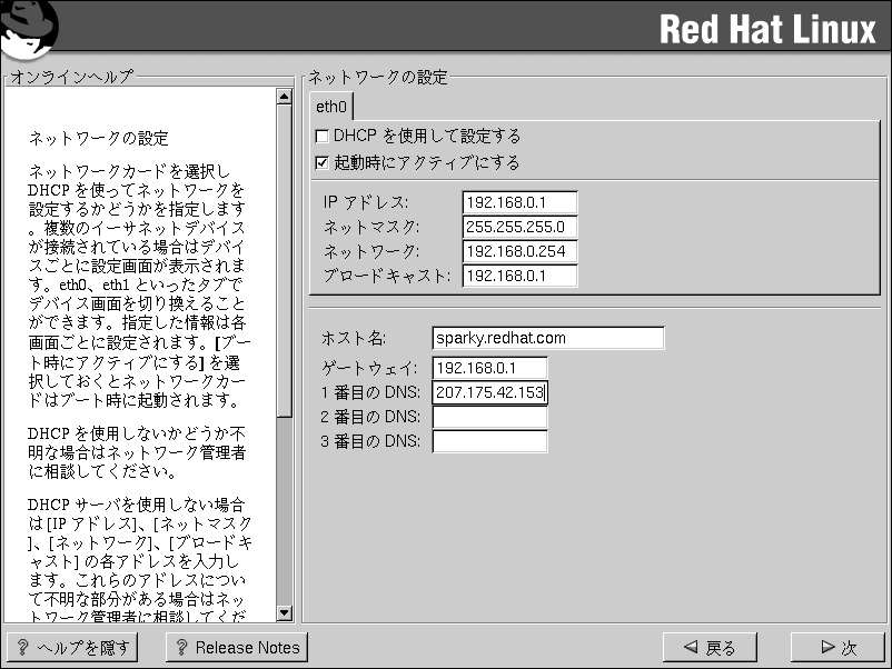 DHCP(Dynamic Host Configuration Protocol)を使用してIP アドレスを設定するかどうかを 指示します。起動時にアクティブにするを選択すると、起動時にネットワーク インターフェイスが開始されます。DHCPクライアントのアクセス権がない場合や、ここに何を入力すれば よいか分からない場合は、ネットワーク管理者に問い合わせて下さい。