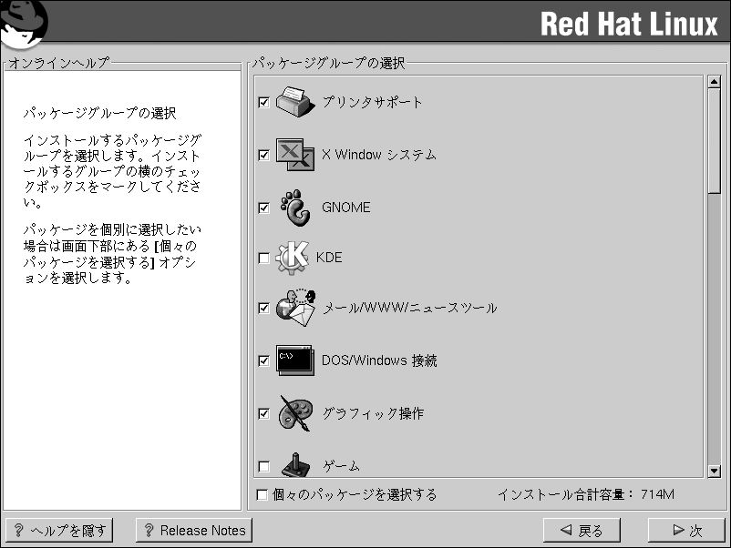 パッケージの幾つかは (例えば、カーネルや一部のライブラリ) 全てのRed Hat Linux システムに要求されていて、選択と選択解除には選べません。 これらの基本パッケージはデフォルトで選択されています。 |