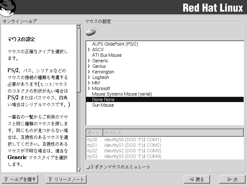 3ボタンのエミュレートチェックボックスは2ボタンマウスに 3ボタンマウスの様な機能を与えるものです。一般的に、X Windowシステムでは3ボタンマウスの方が 操作しやすくなります。このチェックボックスを選択すると2つのマウスボタンを同時に押すことによって 3番目の中ボタンの機能を模倣することができます。