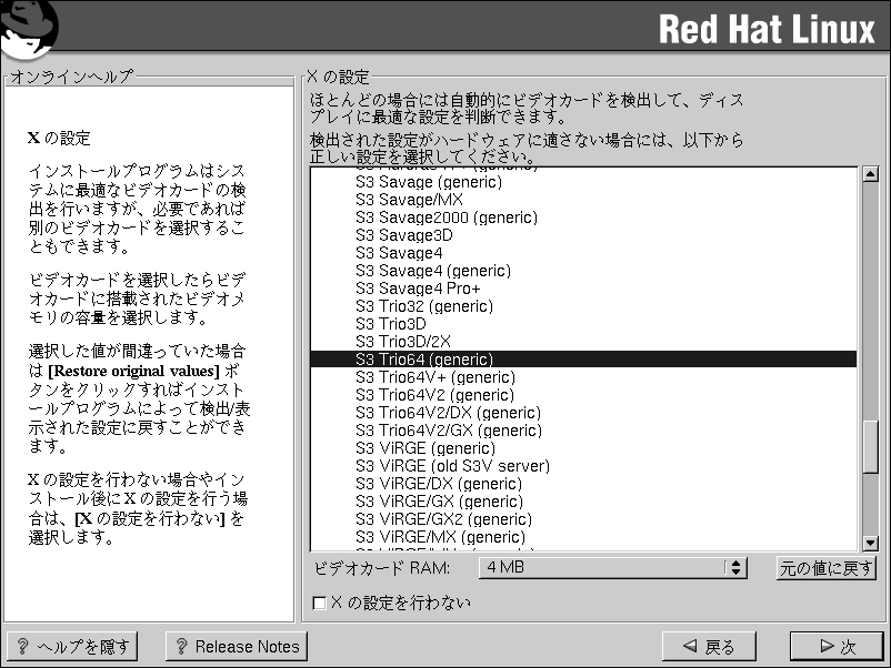 X Window Systemパッケージをインストールする場合は、ここでX サーバを設定することが できます。X Window Systemパッケージをインストールしない場合は、以下を飛ばして パッケージのインストール項へ進んで下さい。