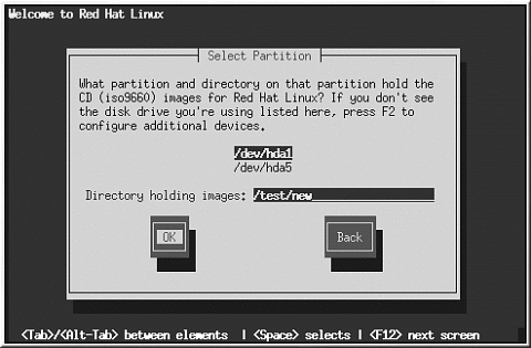 Red Hat ISO イメージを含んでいるパーティションのデバイス名を入力します。また。 イメージを含むディレクトリというラベルのフィールドがあります。 ISO イメージがそのパーティションの rootディレクトリにない場合は、ISO イメージのある 場所のパス名をそのフィールドに入力します。(例えば、ISO イメージが /test/new/RedHat にあれば、/test/newと入力します)。