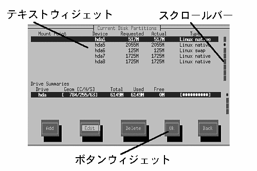 Red Hat Linuxの テキストモードインストールプログラムは、画面単位のインターフェイスを 採用し、グラフィカル ユーザーインターフェイスで広く使われているスクリーン ウィジェットをベースにしています。図5-1 と 図5-2でその画面を見ることができます。