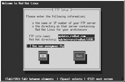 インストール元のFTPサイトの完全修飾ドメイン名かIPアドレスと、アーキテクチャ用の RedHatインストールファイルを含むFTPサイト上の ディレクトリの名前を入力します。例えば, FTP サイトが次のディレクトリを 含む場合は;
