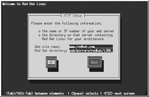 Red Hat Linuxのインストール元となるHTTPサイトの名前かIPアドレスと、アーキテクチャ用の RedHatインストールファイルを含むディレクトリの名前を 入力します。例えば、 HTTPサイトが次のディレクトリを含んでいる場合;