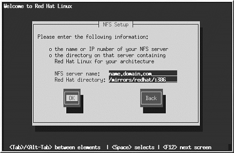 NFSサーバが /mnt/cdrom上にRed Hat Linux CDをマウントした とすると、Red Hat ディレクトリフィールドには /mnt/cdromと入力します。NFSサーバがCDではなく、 Red Hat Linuxインストール ツリーのミラーをエキスポートしている場合は、 RedHatディレクトリを含むディレクトリを入力します。 例えば、NFSサーバが次のようなディレクトリを持つ場合;