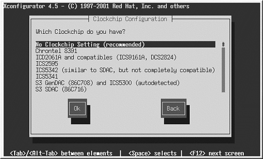 次に、ビデオカードでクロックチップをサポートする場合(チップがある場合)、 クロックチップの設定値を選択します。ほとんどのビデオカード場合、XFree86が 自動的に適切なクロックチップを検出するため、Clockchipを 設定しないを選択するのがよいでしょう。