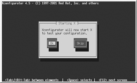 デフォルトのビデオモードか別の指定モードを選択し終ると、Xを起動しています ダイアログで X設定をテストすることができます。