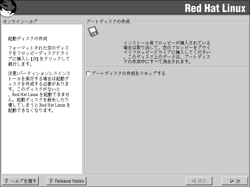 パーティションレスインストールを実行することにした場合は、ブートディスクを作成する必要があります。このディスクがないとRed Hat Linuxを起動できません。このディスクをなくしたり破損したりすると、Red Hat Linuxを起動できなくなります。 |