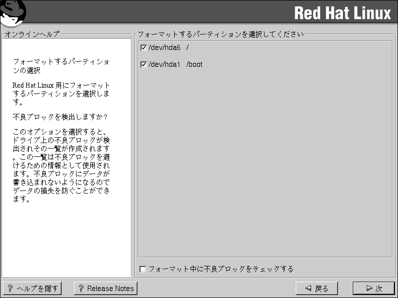 [フォーマット中に不良ブロックを検査する]を選択すると、インストール処理を終えるのに非常に長い時間がかかる可能性があります。最近のハードディスクドライブはサイズが大きいため、不良ブロックの検査にはハードディスクドライブの容量に応じてかなりの時間がかかります。不良ブロックの検査を選択した場合は、仮想コンソール6で進捗状況をモニターできます。 |